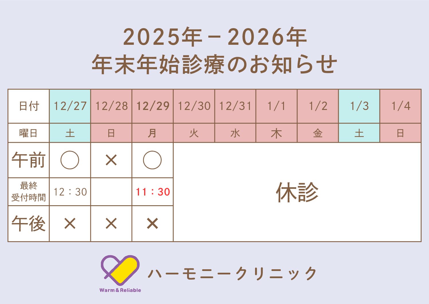 12月29日(月)は午前のみ診療を行います。 受付終了は11時30分、診察終了は12時00分となります。 通常とは受付・診察終了時間が異なりますのでご注意ください。 年始は2026年1月5日(月)より、通常通り診療を開始いたします。 ご不便をお掛けいたしますが、何卒よろしくお願い申し上げます。
