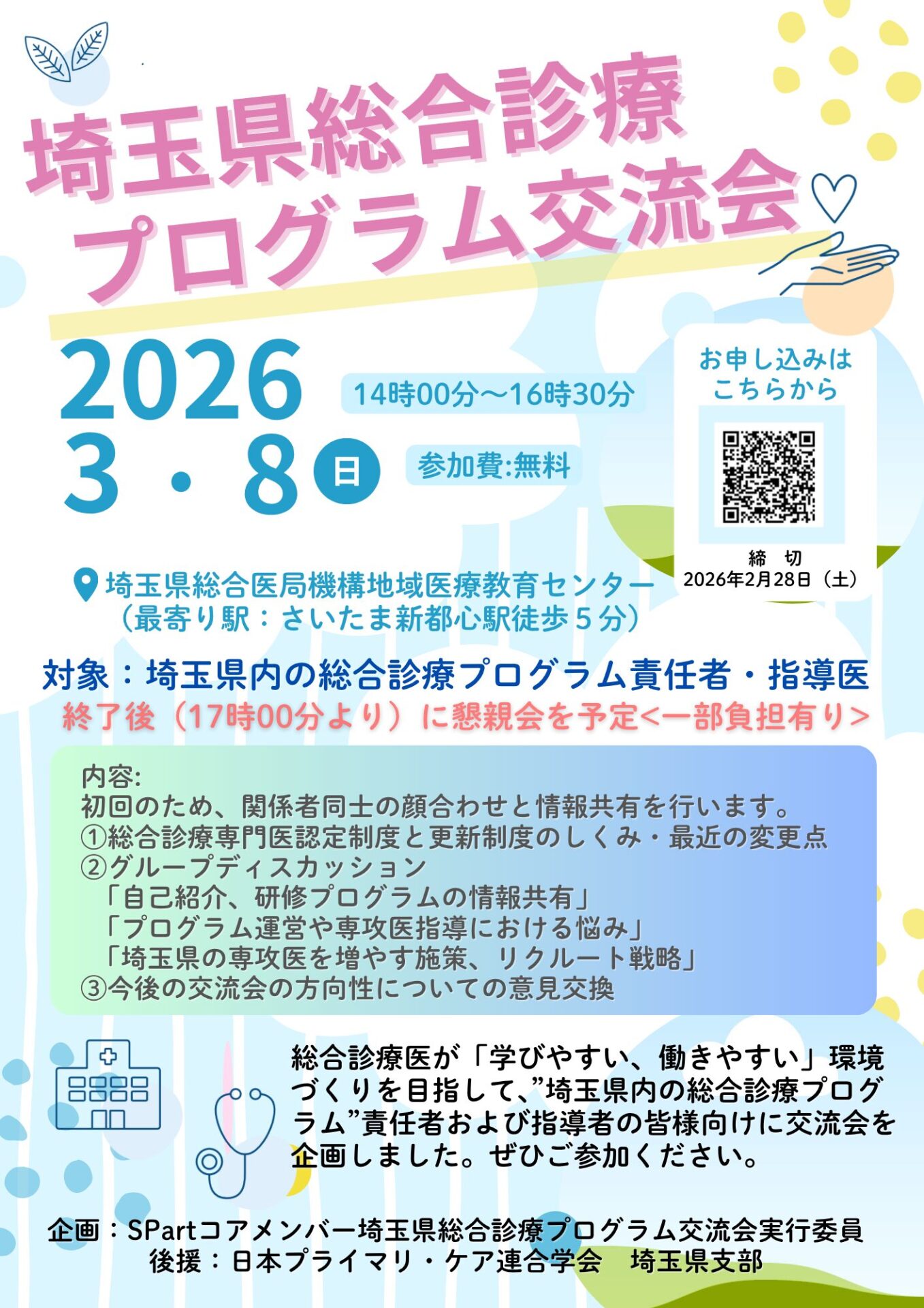 今回は第1回目として、関係者同士の顔合わせとともに、専門医制度の最新動向の共有や、プログラム運営・リクルート戦略に関するディスカッションを行います。日頃の悩みや工夫を共有し、埼玉県全体の総合診療を共に盛り上げていきませんか?